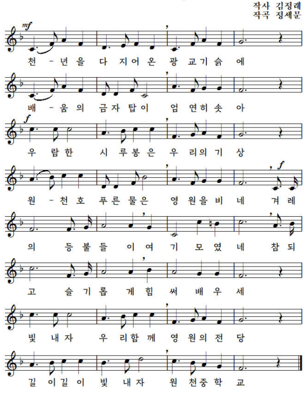 교표의 전체적인 모양은 '중'자를 의미하고 가운데 도안은 수원의 원천 중학교를 나타내며, 테두리를 원으로 처리한 것은 원처럼 알찬 실력을 바탕으로 원만한 품성을 함양하라는 의미임.
